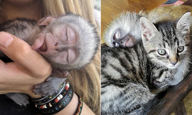 萌爆了!小猴子抱著貓咪入睡!